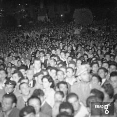 Manifestazione per la consegna di quote e poderi della riforma agraria. Luigi Gui e persone sul palco, inizio anni 50