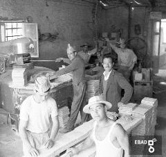Operai tra blocchi di cemento nella fabbrica Visconti