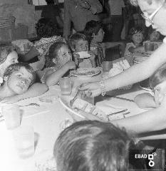 Bambini ed educatrice durante la preghiera in mensa prima dei pasti