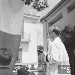 Sacerdote e autoritā militari davanti a una chiesa ( S. Cesareo ?)