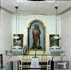 Sacerdote e persone della congrega davanti alla statua dei S.S. Cosma e Damiano