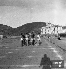 Atleti impegnati in esercizi ginnici nel campo sportivo