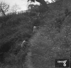 Operai e dirigenti in una zona di collina con alberi di ulivo. Muretti in pietra lungo una strada