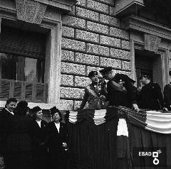 Colonia, piazzale davanti all'edificio-Autorità militari e dirigenti su un palco che assistono alle manifestazioni militari dei balilla