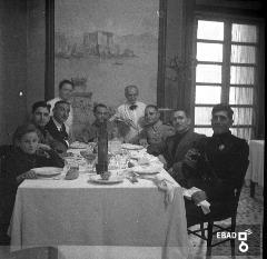 Esterno: autorità militari e civili in visita ai bambini della "Colonia marina Mussolini"-Vista laterale dell'edificio scolastico"tecnico industriale Francesco Trani"