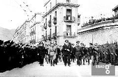 Autoritā militari e civili davanti a un edificio con scritta Biliardo