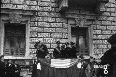 Autorità militari su un palco allestito nel piazzale davanti ad un edificio