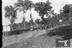 Raduno di militari in uno steccato in aperta campagna e torre di comando