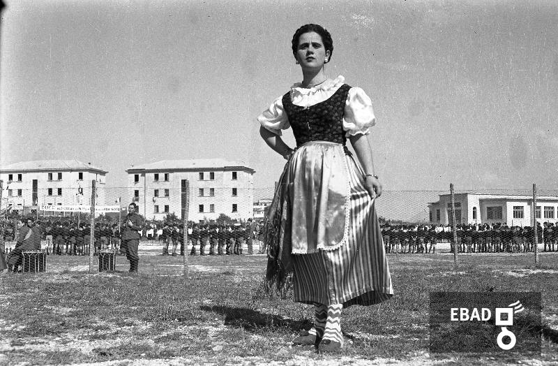 Donne in abiti tradizionali nel campo sportivo Littorio in occasione di una manifestazione fascista, anni 30