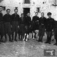 Giovani in posa con al centro un gerarca nel campo sportivo Littorio.Vista del palazzo Malangone, anni 30