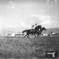 Gara ippica con inquadratura di scuderie e palazzine per civili